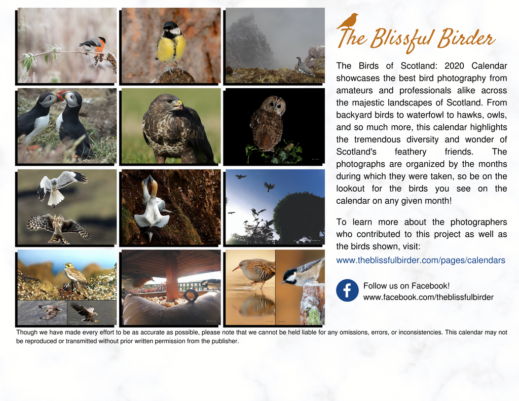 The Birds of Scotland: 2020 Calendar showcases the best bird photography from amateurs and professionals alike across the majestic landscapes of Scotland. From backyard birds to waterfowl to hawks, owls, and so much more, this calendar highlights the tremendous diversity and wonder of Scotland's feathery friends. The photographs are organized by the months during which they were taken, so be on the lookout for the birds you see on the calendar on any given month!