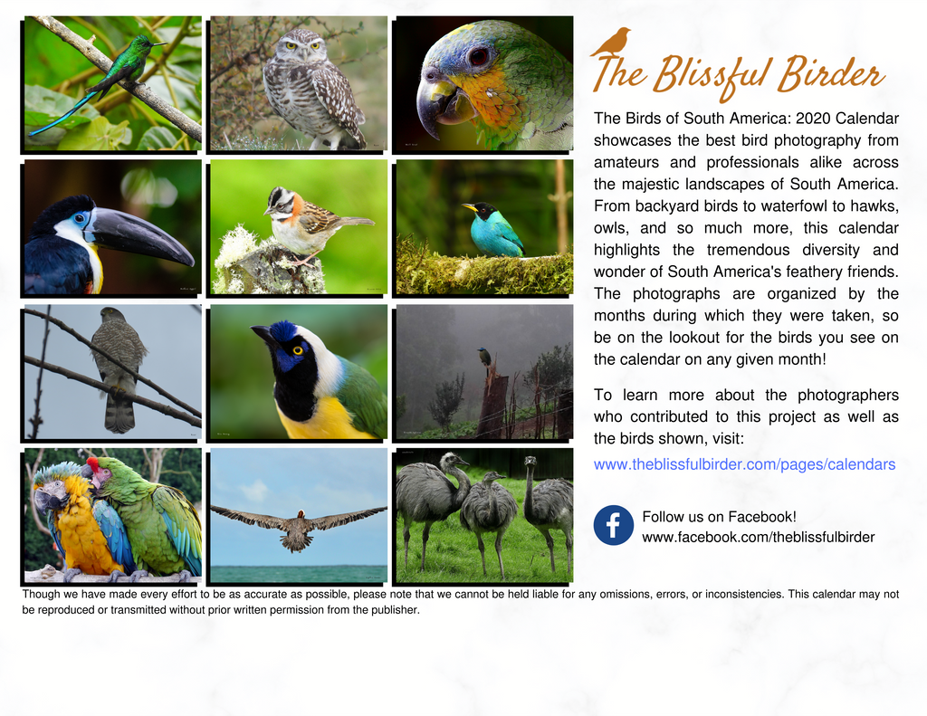 The Birds of South America: 2020 Calendar showcases the best bird photography from amateurs and professionals alike across the majestic landscapes of South America. From backyard birds to waterfowl to hawks, owls, and so much more, this calendar highlights the tremendous diversity and wonder of South America's feathery friends. The photographs are organized by the months during which they were taken, so be on the lookout for the birds you see on the calendar on any given month!