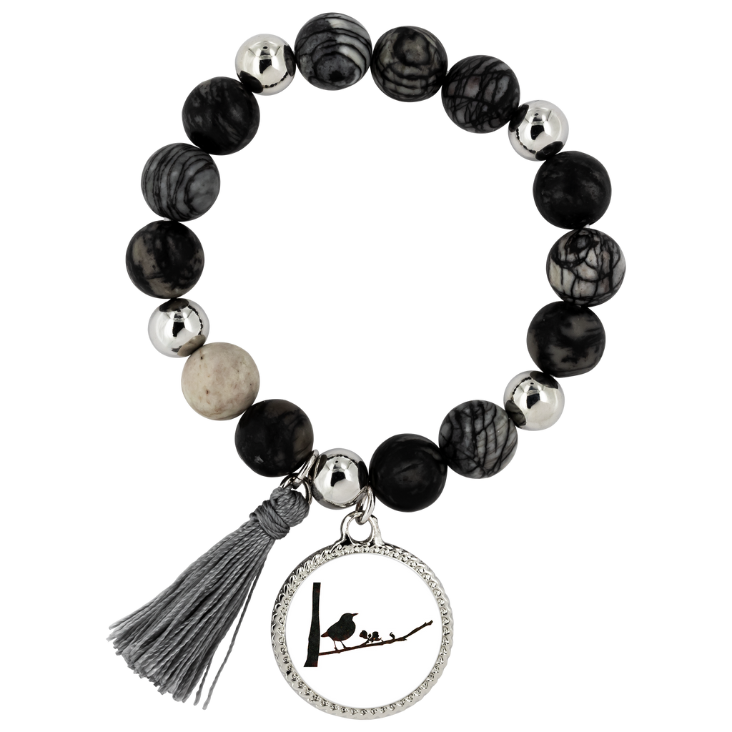 This Lyric style bracelet is a blend of natural onyx and dragon vein stone beads, paired with polished, silver-plated brass beads. Silver-plated charm with cord tassel. Assembled on a stretch cord for easy wear. One size fits all. Each bracelet comes in a re-usable black velvet pouch, perfect for storage or gifting.